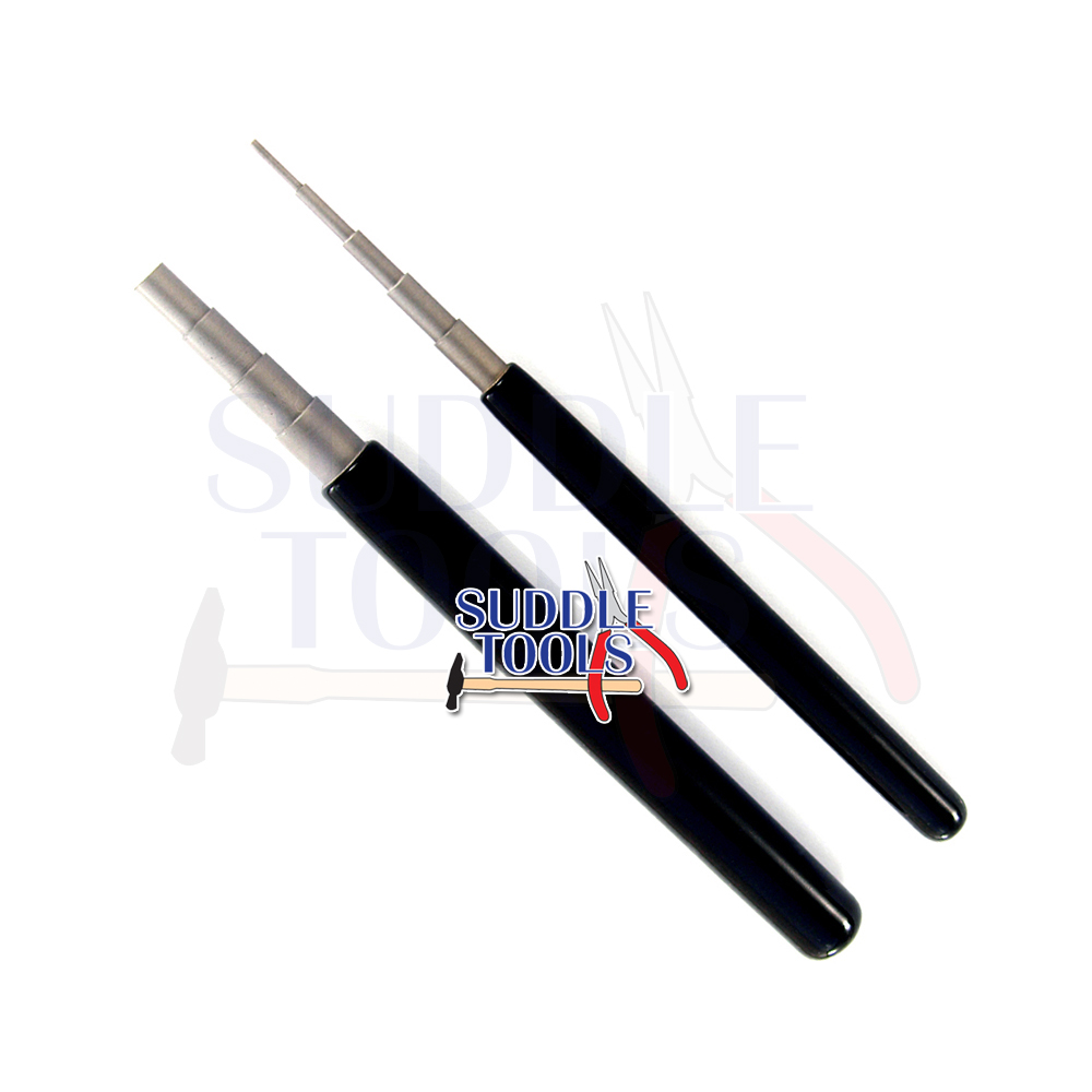 Jump Ring Mandrels – Set of 2. Small and large stainless steel with non-slip PVC handle. Each offers five different diameters. Small: 1.5, 2.5, 3.5, 4.5 and 5mm. Large 6, 7, 8, 9 and 10mm. Nicely rounded and extremely smooth so wire will not be scratched.